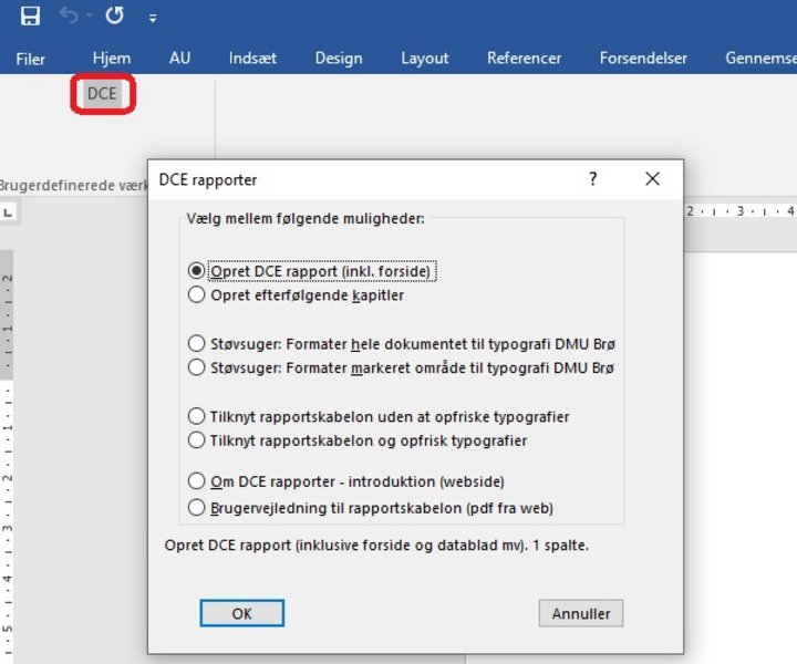 - Vælg 'Opret DCE rapport (inkl. forside)'